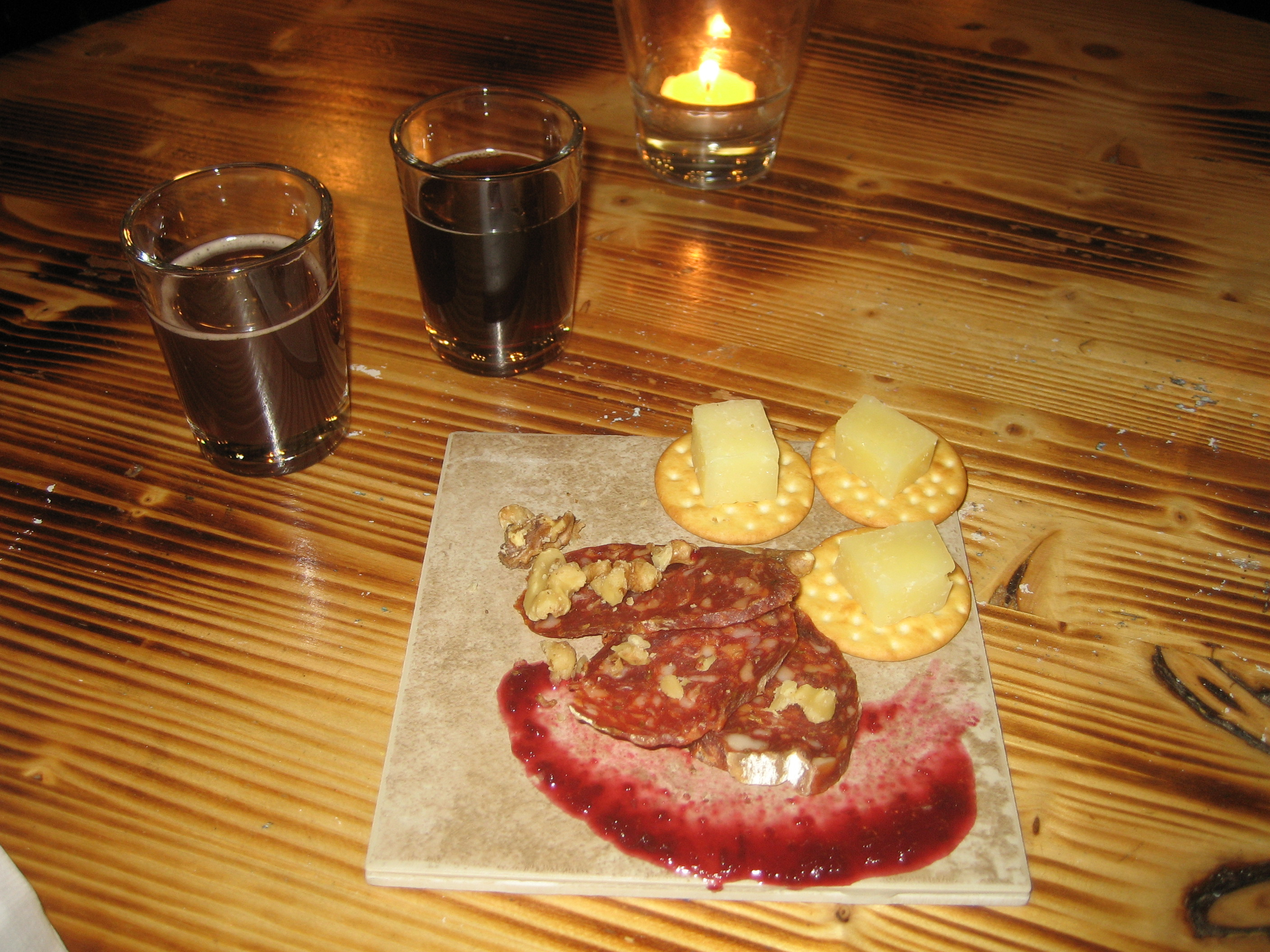 The first course was a charcuterie plate with calabrese salumi, manchego cheese on crisps, walnuts and a cherry compote. This was paired with the Ol’ Smitty’s Wee Heavy. The variant beer was that same scotch ale aged in whiskey barrels and then refermented with a fresh pitch of yeast and fresh blackberry puree. The malt and tiny bit of smoked peat of the scotch ale contrasted well cherry compote. The salt of the salumi, nut, and cheese was great with the whiskey and blackberry of the variant beer. Where the base beer was crisp, but rich, the pectin the variant made for a much bigger feel, and worked well with the salumi as well.