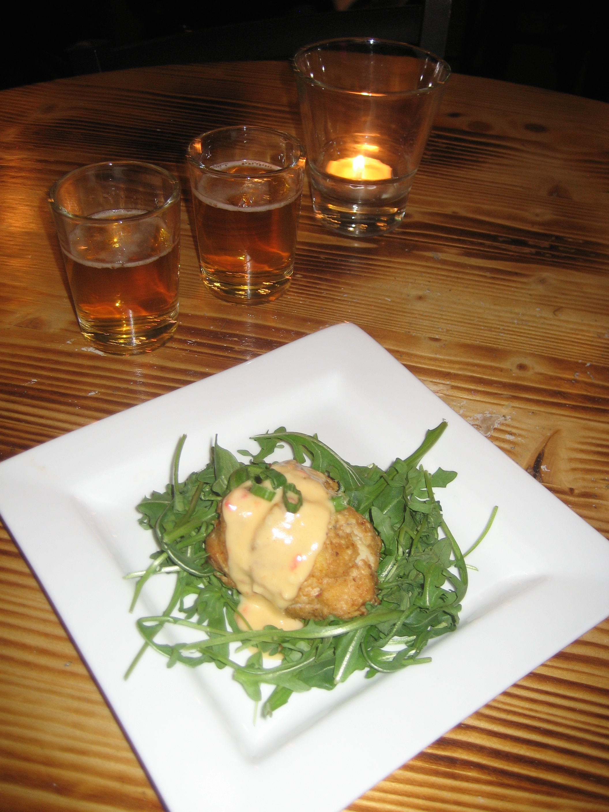 The occasional question from the guests was discussed by Dan, such as how long beers stayed in barrels and what it meant for the beers to be refermented. But for the most part, as people finished one course and were discussing their thoughts on the food and the beer, the beers for the next course would start to appear. In this case, the next beers were the uber-clean Rhapsody pilsner and a variant dry hopped with Czech Saaz hops. This was my favorite beer of the night. What the Saaz did to mellow the fruit of the pilsner and to set off the sweetness of the crab cake with lobster mornay was something to behold. Yep, your read that right, an almost completely crab-containing crab cake with lobster sauce.