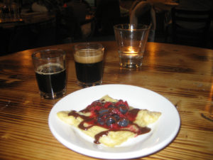 The evening finished up with a dessert offering of puff pastry with baked brie and mixed berries, set off by a dark chocolate sauce. Paired with this was a classic dessert beer, the Genesis Milk Stout on nitrogen, and a variant of that beer aged with coffee and cocoa nibs. As far as the pairings went, this was the best of the night for me. The coffee with the pastry was fantastic, and this is from a guy who doesn’t drink coffee. The aroma of the chocolate on the dessert and the cocoa in the beer was good as well, and the roast of the milk stout really complimented the bit and acid of the mixed berries.