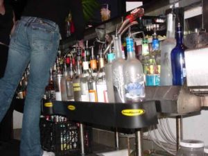 5) Drink rail – If the bar rail is to keep you from spilling your drink off the front to the bar, the drink rail serves just about the same purpose for the bartender. Located on the working side of the bar top, this is an area for making drinks and usually has a trough and drain. This is where the bartenders set the longer drink mats that have raised rubber nubs to keep the drinks off the surface so that they don’t sit in any spilled liquid. Some drink mats have squares at the end with no nubs that are flatter and more stable for preparing drinks. There are also larger drink mats for putting out finished drinks to be picked up by servers and for empties that come back. All of them can be perforated and/or have nubs.